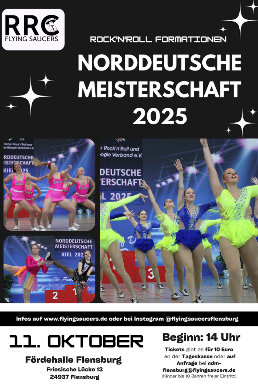Am Samstag den 11.10.25 ab 1400 Uhr veranstalten wir die Norddeutsche Meisterschaft der Formationen im Rock'an'Roll in der Förderhalle ( Friesische Lücke. 13) in Flensburg.